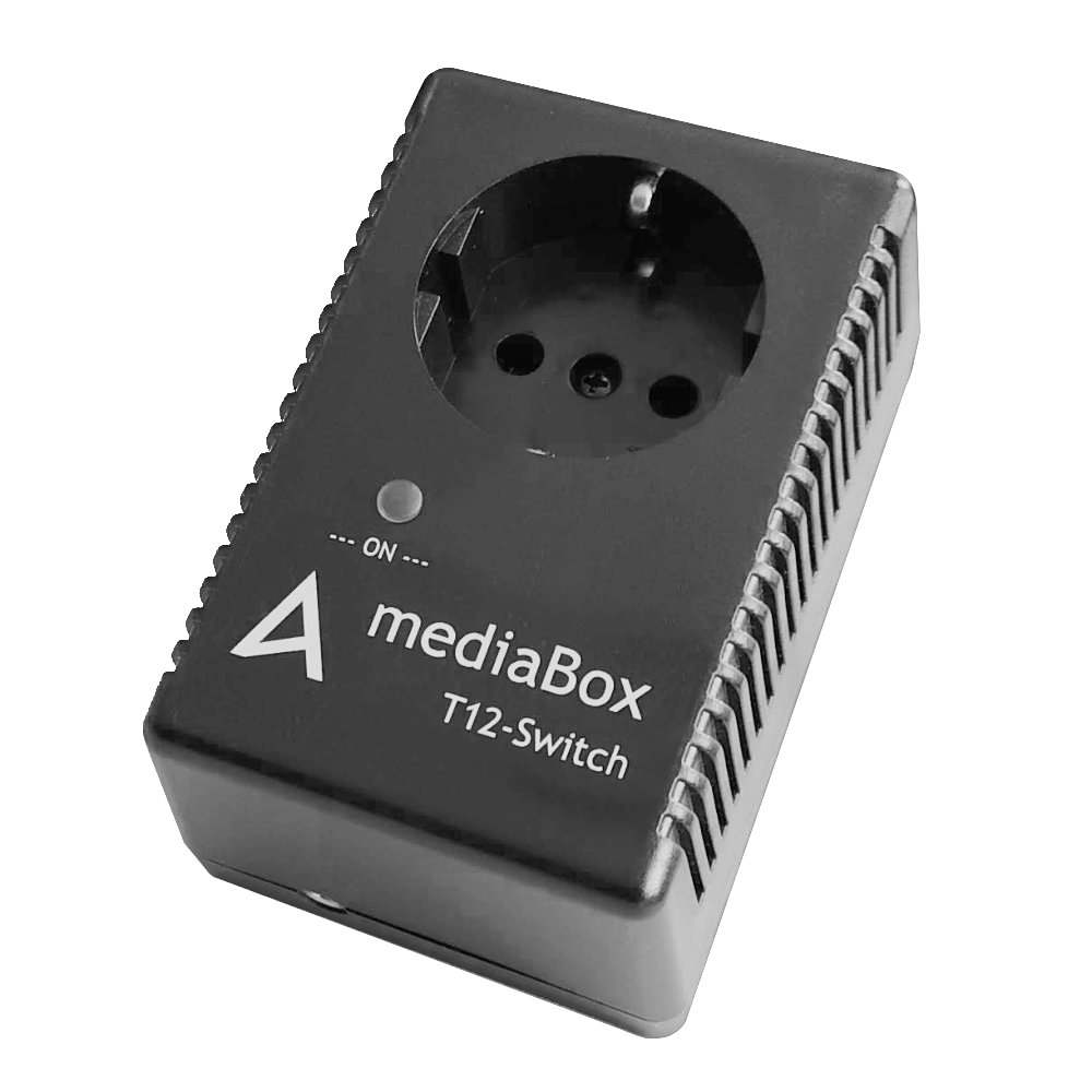mediaBox T12-Switch hat eine SCHUKO-Steckdose, über die die angeschlossenen 230V-Geräte bis zu einer Leistung von 2000W geschaltet werden können. Die Ansteuerung erfolgt über ein 12V-Triggersignal aus Mediengeräten wie z.B. AV-Receivern, Verstärkern oder Beamern. Die Steckdose wird eingeschaltet, wenn über die 3,5mm-Klinkenbuchse das 12V-Triggersignal angelegt wird. Die