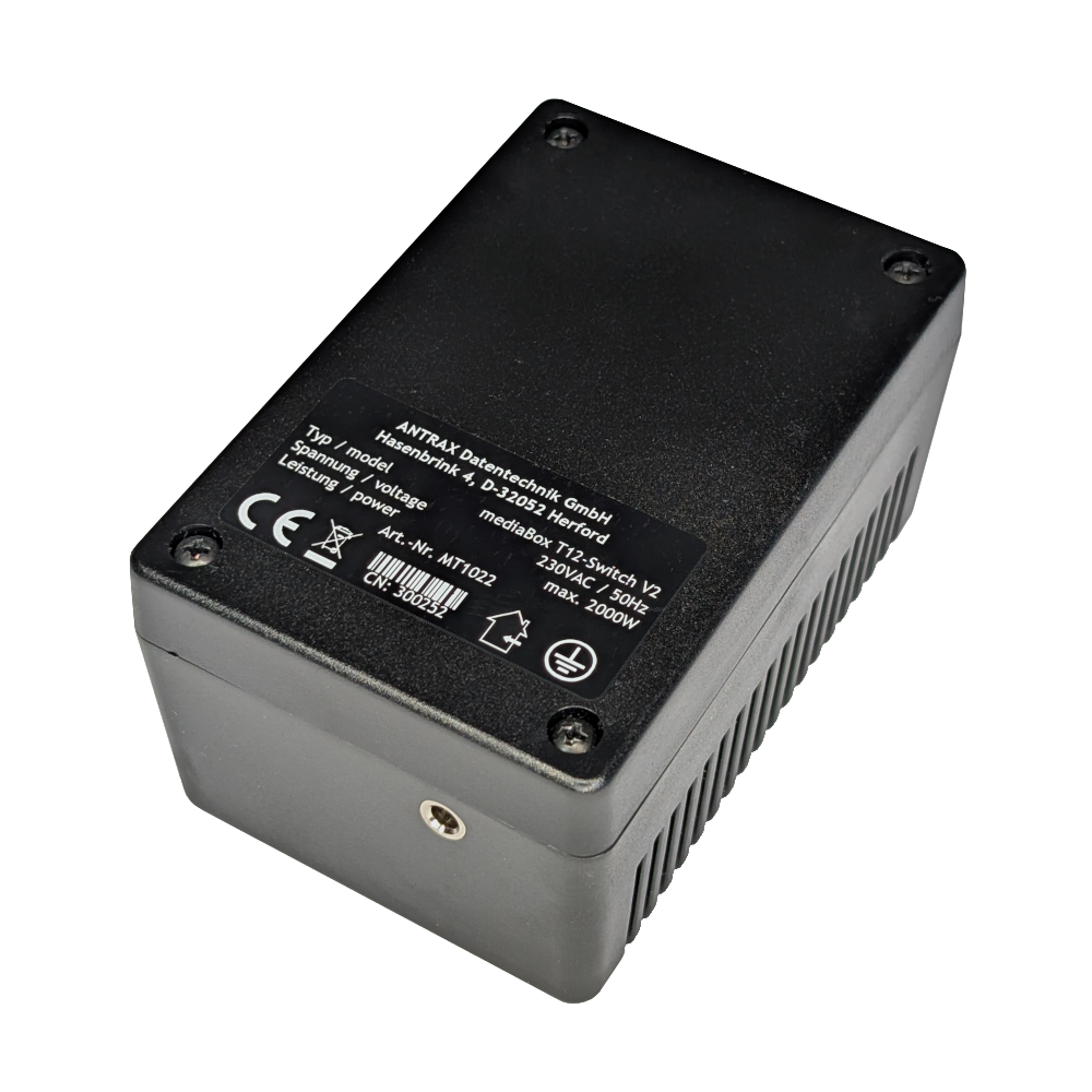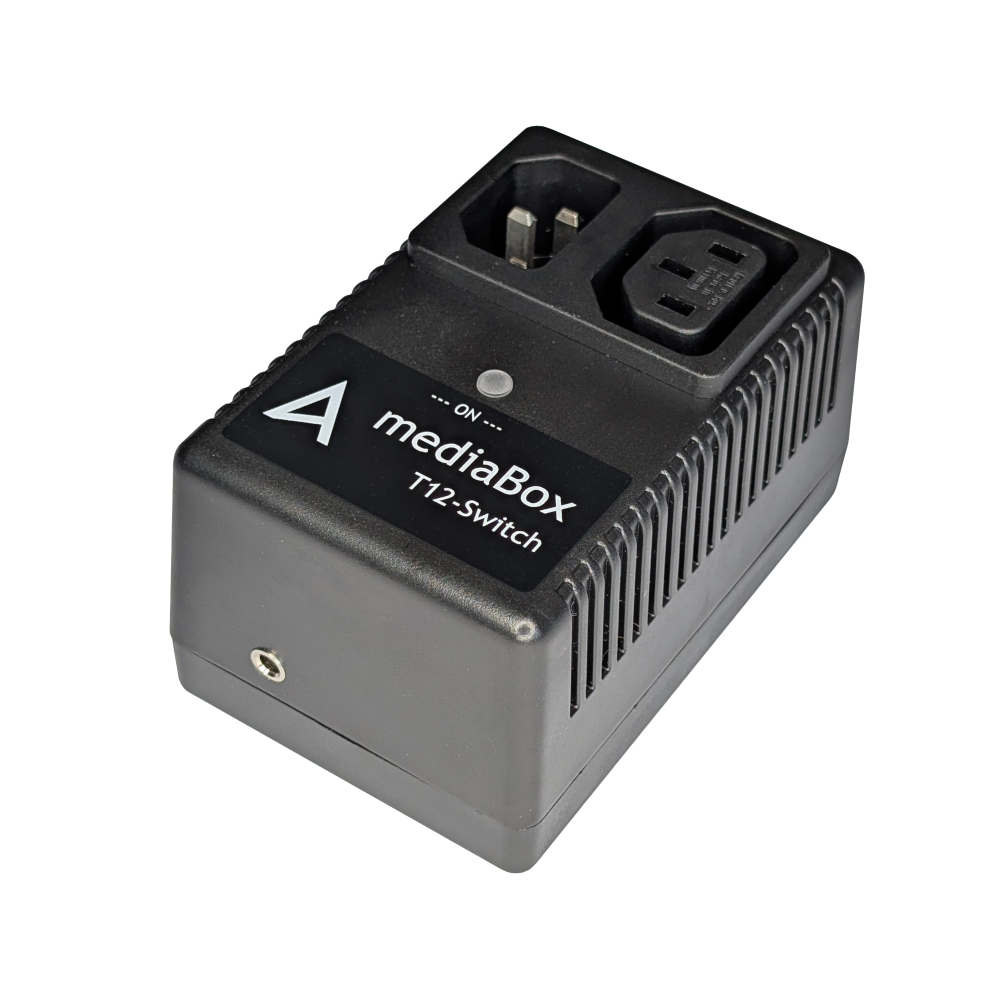mediaBox T12-Switch hat einen Kaltgerätestecker, über den die angeschlossenen 230V-Geräte bis zu einer Leistung von 2000W geschaltet werden können. Zur Vermeidung von Brummschleifen sind die Kontakte der Kaltgeräteverbindungen selbstverständlich pin-richtig verkabelt (besonders wichtig bei Mediengeräten)! Die Ansteuerung erfolgt über ein 12V-Triggersignal aus Mediengeräten wie z.B. AV-Receivern, Verstärkern oder Beamern. Die Steckdose wird eingeschaltet, wenn über die 3,5mm-Klinkenbuchse das 12V-Triggersignal angelegt wird. Die