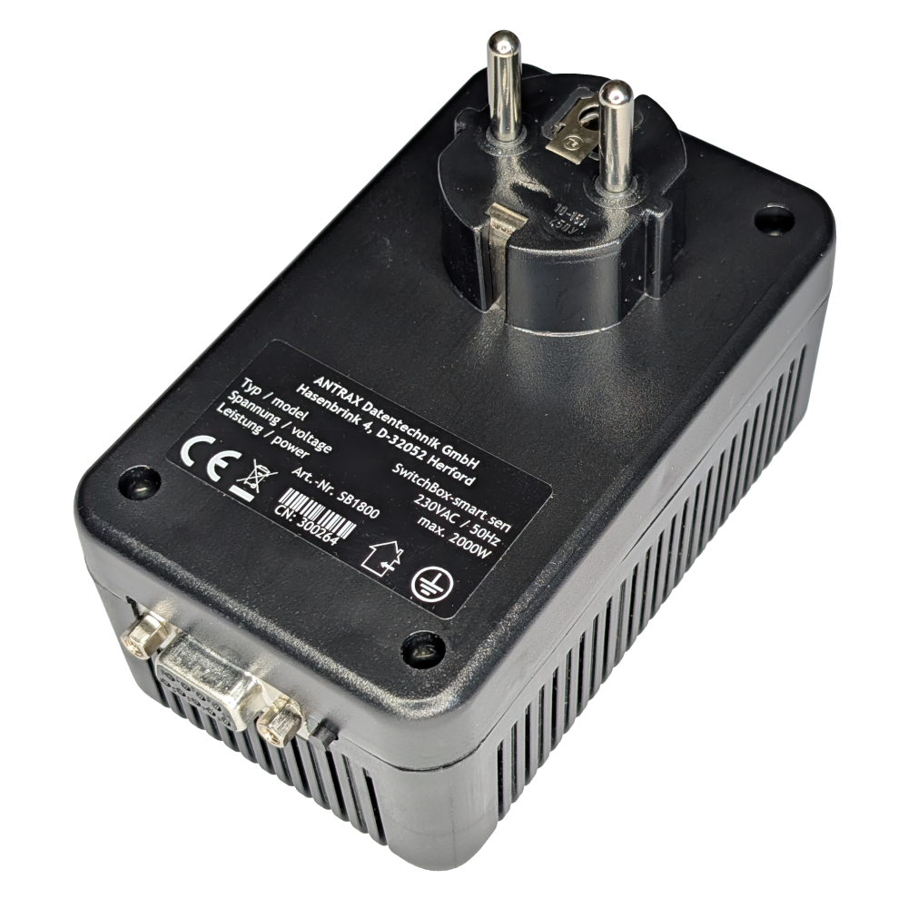 SwitchBox-smart besteht aus einem Steckergehäuse mit seriellem Anschlusskabel (9pol. SUB-D) oder USB-Anschlusskabel. Geschaltet werden kann eine Last von 2000W, also genug für einen PC mit angeschlossenem Monitor und Drucker. Über einen Taster kann die