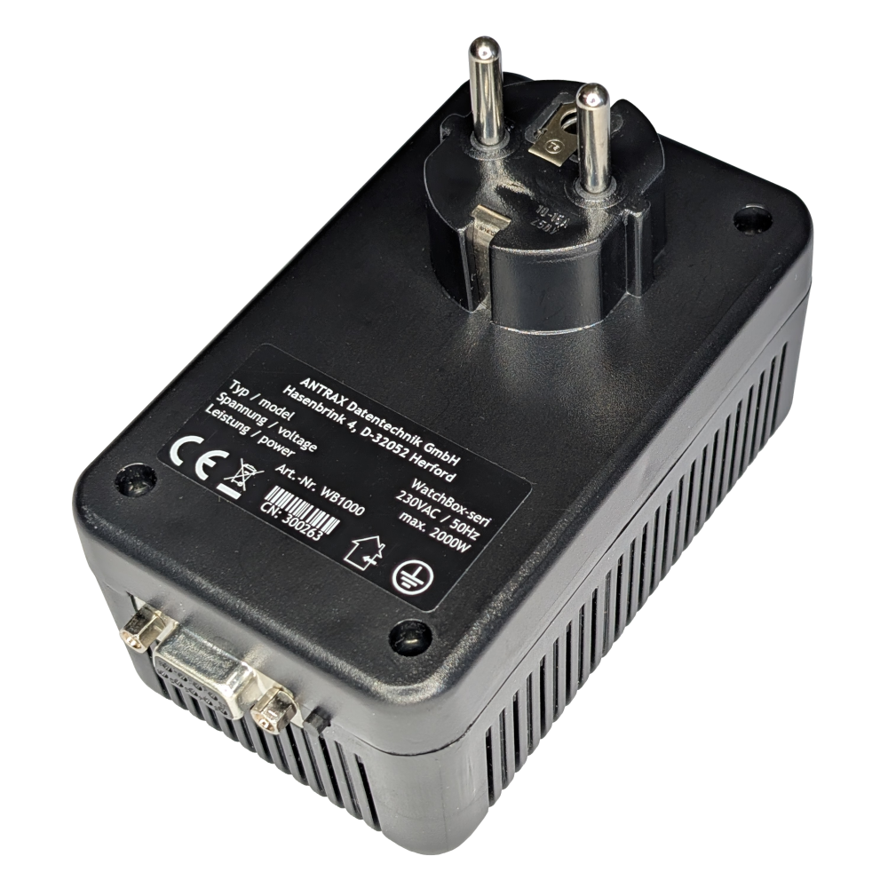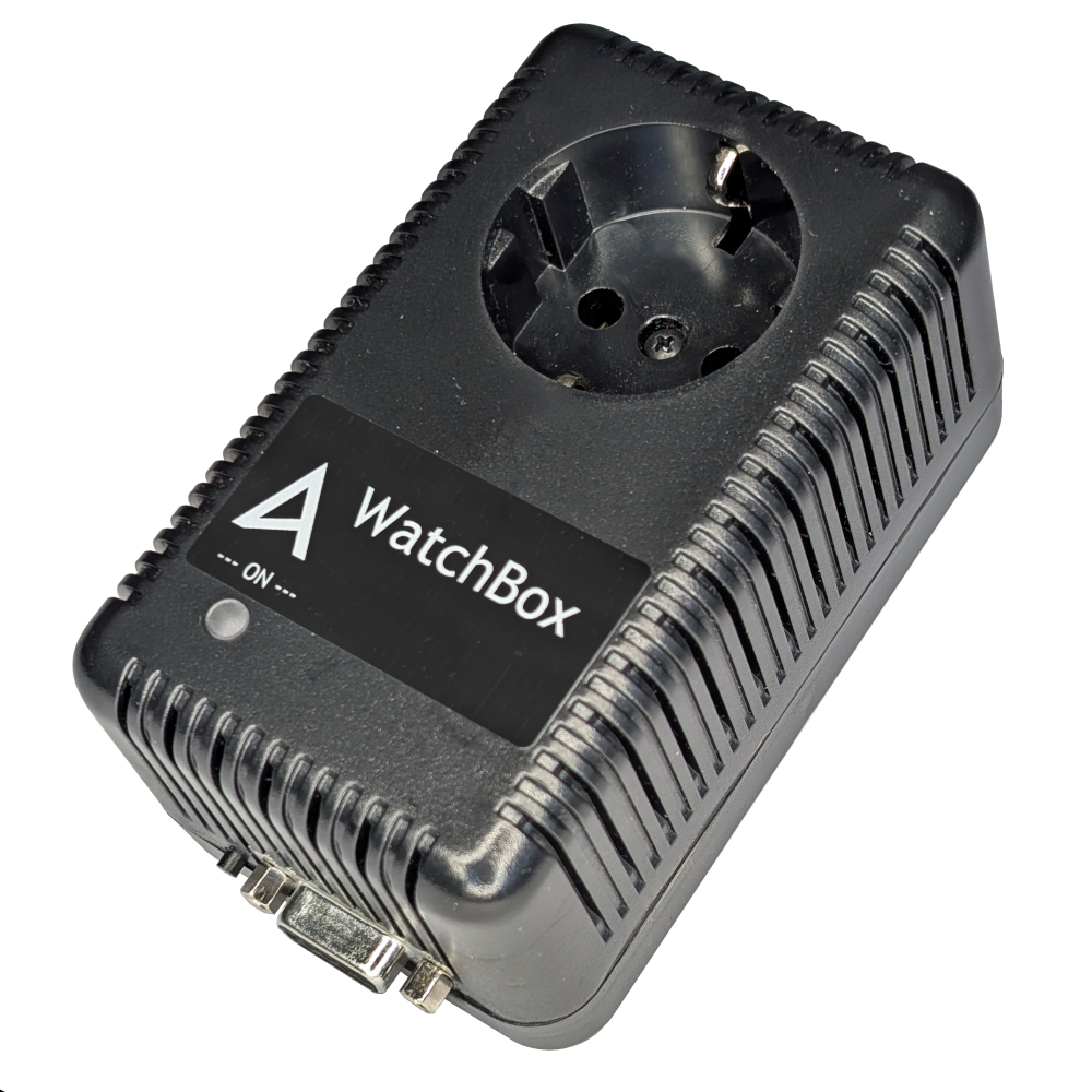 WatchBox besteht aus einem Steckergehäuse mit seriellem Anschlusskabel (9pol. SUB-D) oder USB-Anschlusskabel. Geschaltet werden kann eine Last von 2000W, also genug für einen PC mit angeschlossenem Monitor und Drucker. Über einen Taster kann die